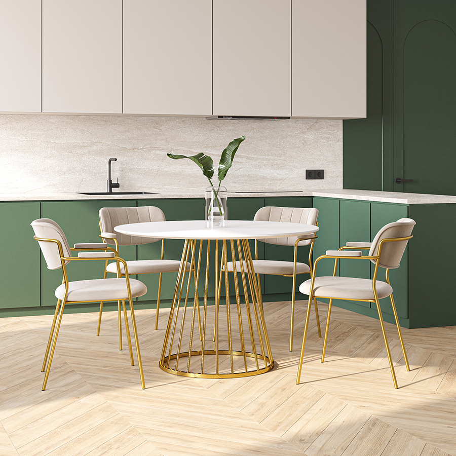 Обеденная группа: стол Tyra, Ø110 см, белый/золотой и стул Eirill, темно-зеленый, 4 шт.