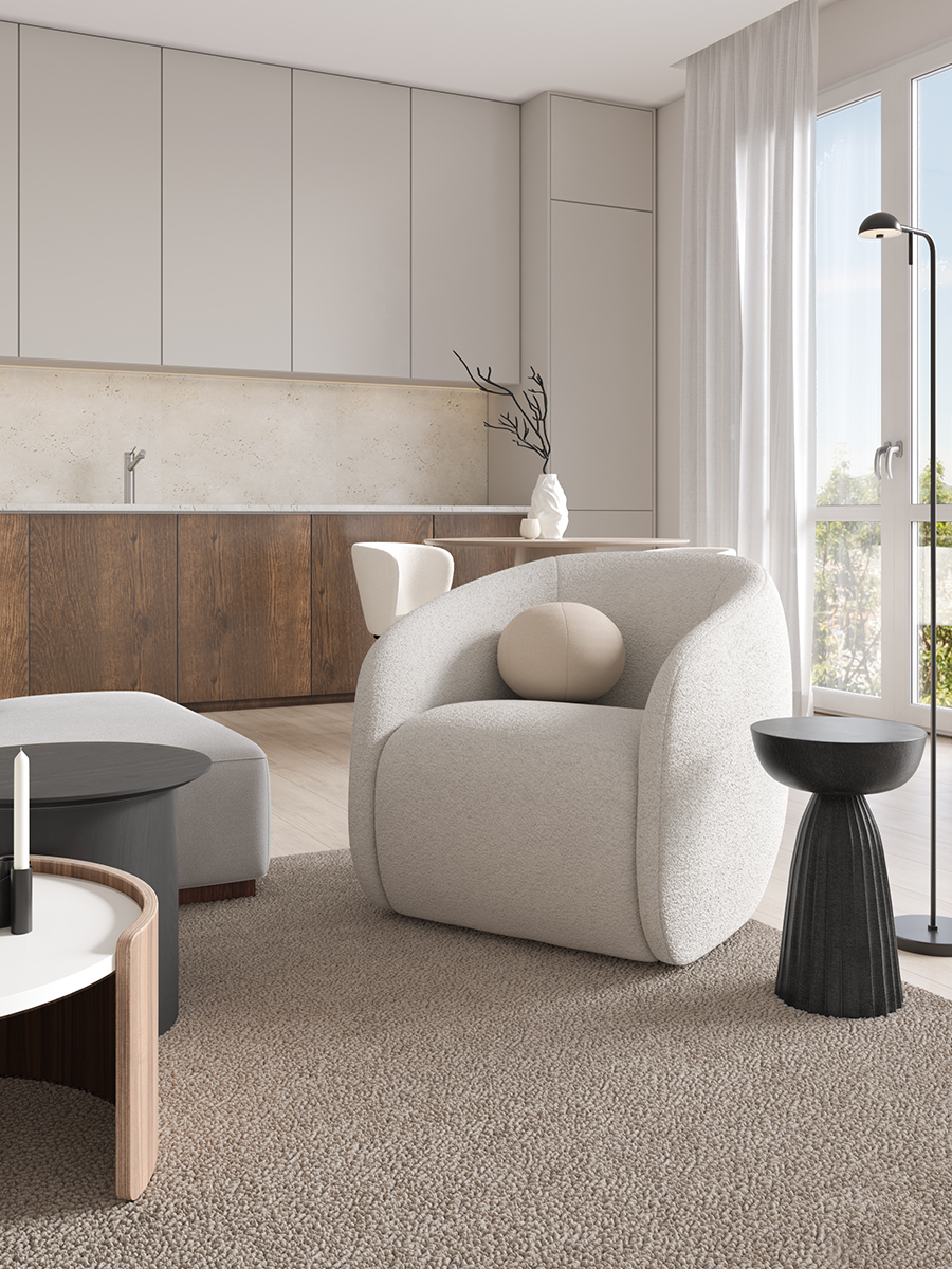 Мягкая посадка и продуманная геометрия позволяют использовать кресло как самостоятельный элемент или в паре с диваном, формируя гармоничную зону отдыха.