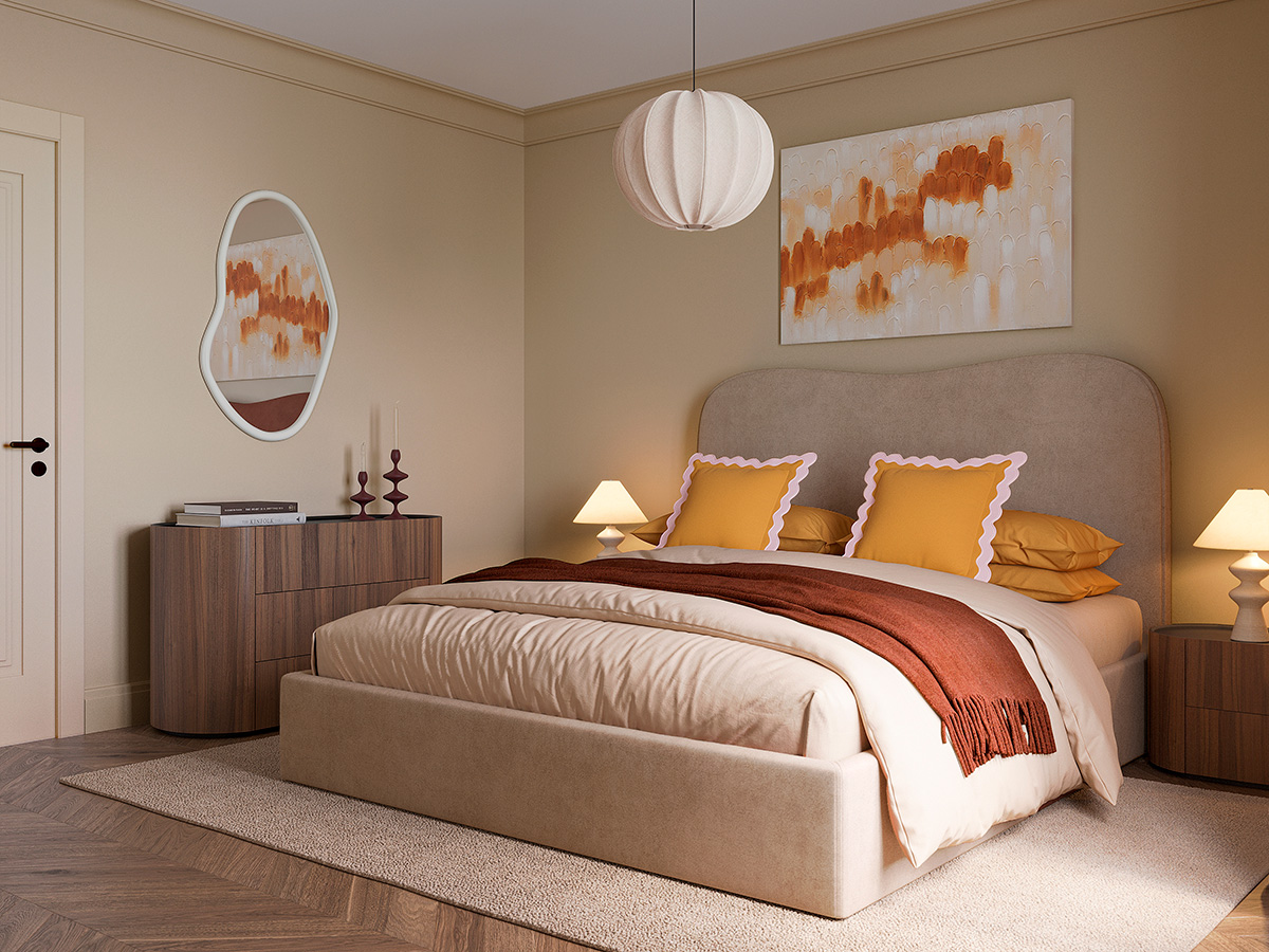- Плавные линии — создают ощущение спокойствия и визуально смягчают пространство спальни.