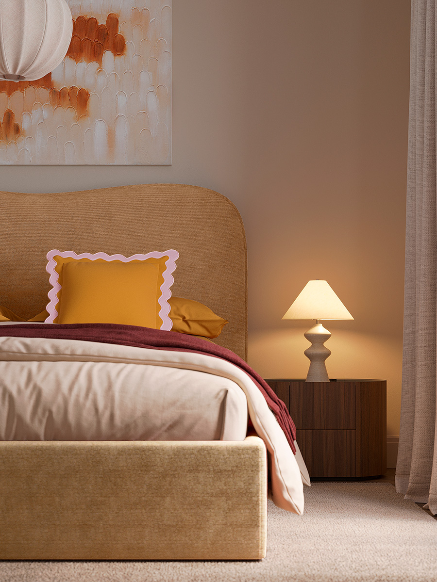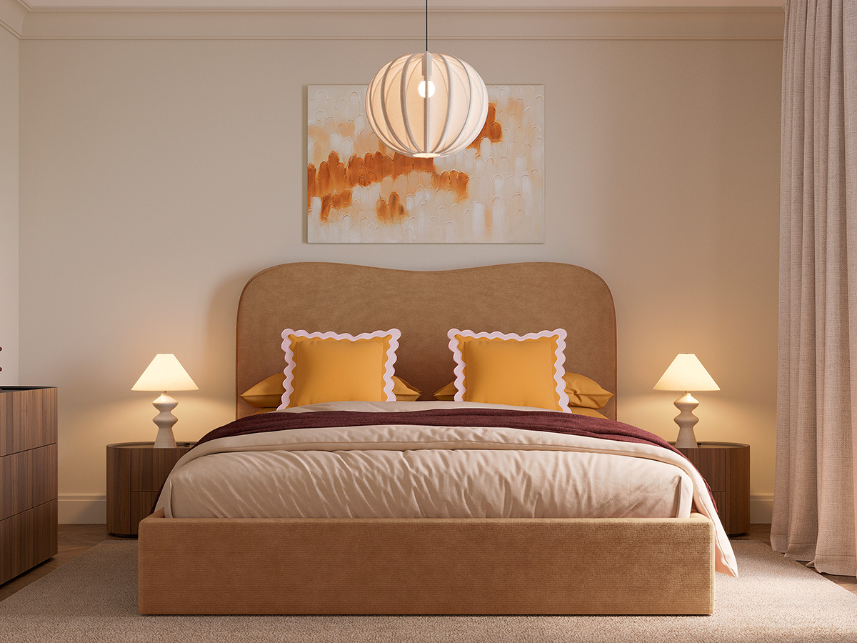 - Мягкое фигурное изголовье — комфортная опора для отдыха и выразительный визуальный акцент.
