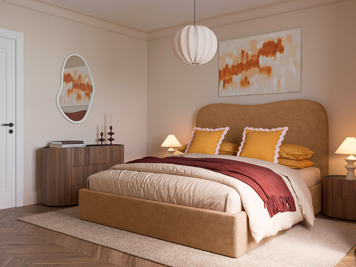 Модель органично вписывается в современные стили — от мягкого минимализма до контемпорари, легко сочетаясь с текстилем, светом и прикроватной мебелью.