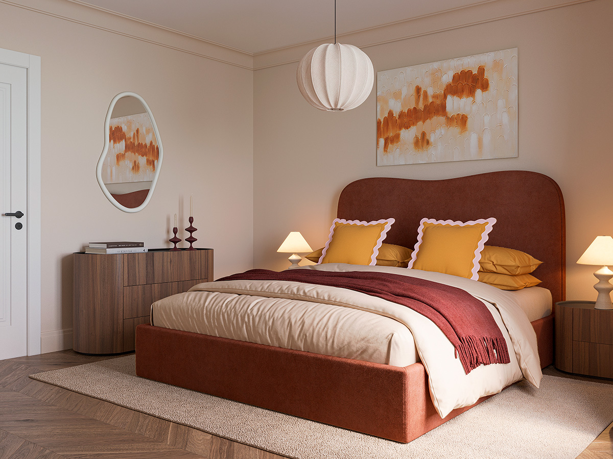 Модель органично вписывается в современные стили — от мягкого минимализма до контемпорари, легко сочетаясь с текстилем, светом и прикроватной мебелью.