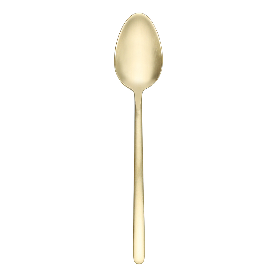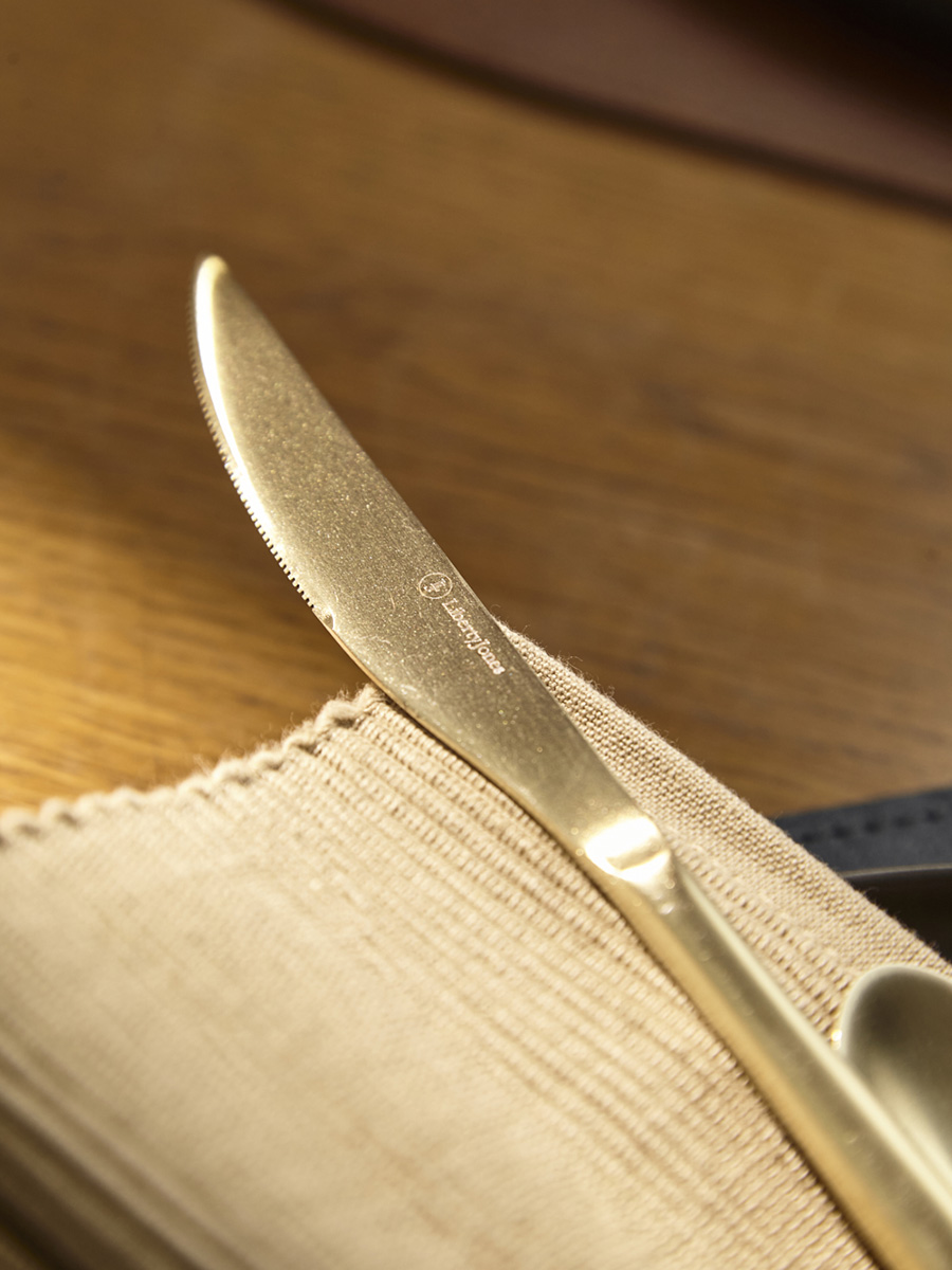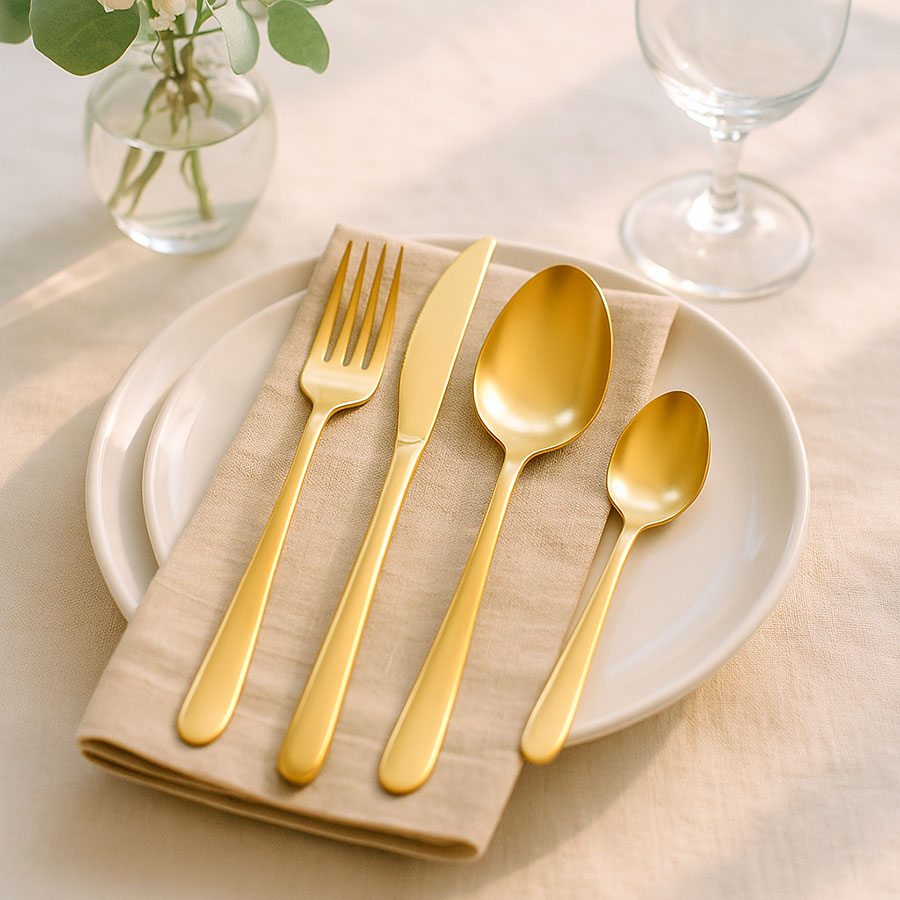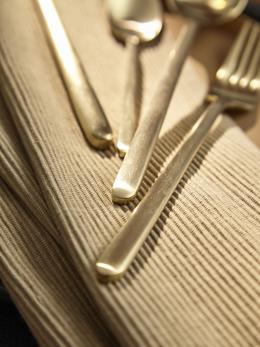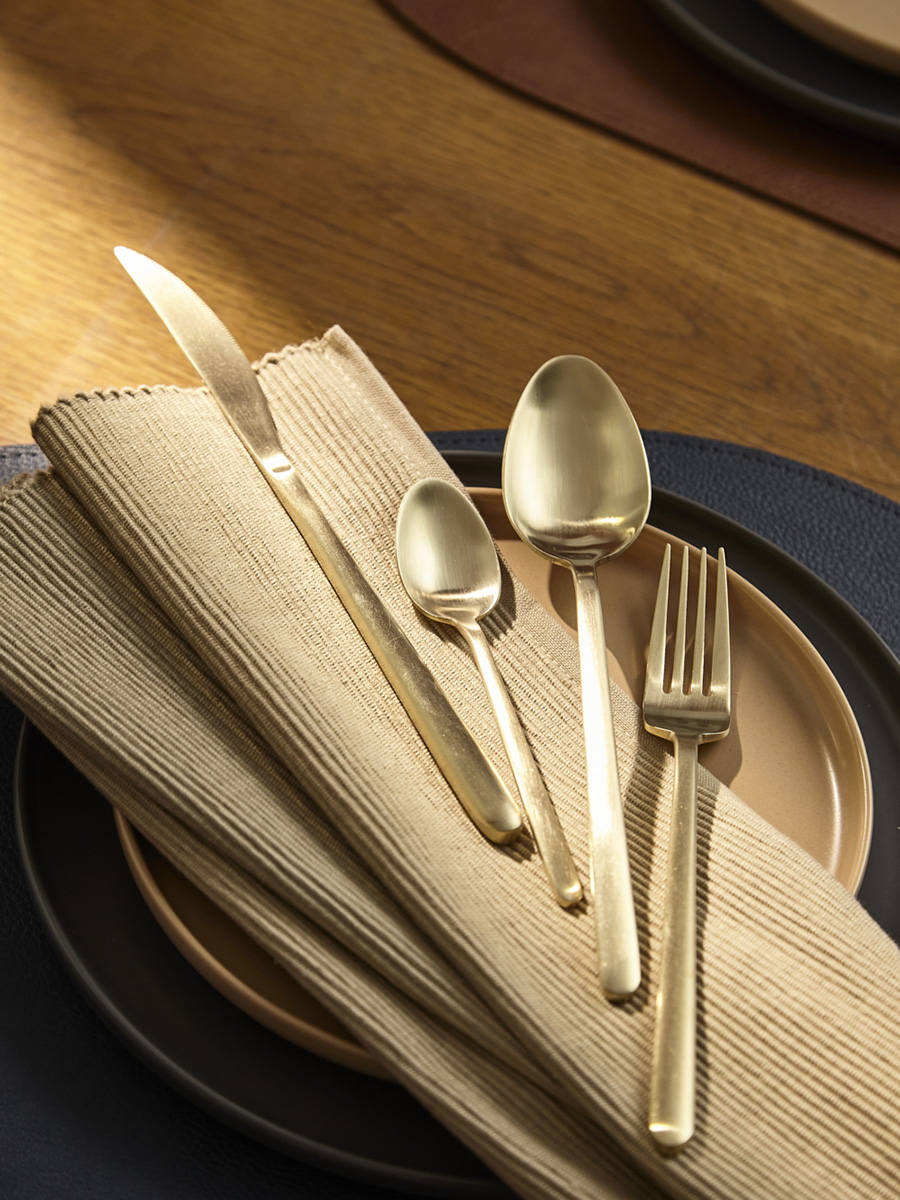 - Столовые приборы золотистого цвета с матовой полировкой отлично подойдут для сервировки в традиционном и современном стиле. Их сдержанная элегантность прекрасно гармонирует с простыми формами и нейтральными цветами.