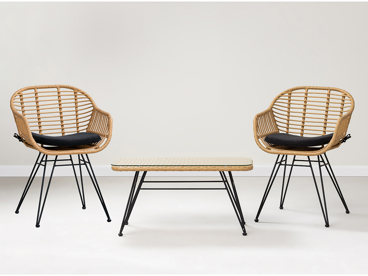 Материалы: стол – сталь, искусственный ротанг, стекло. Размеры: 80х40х40 см. Расстояние между ножками: 73 см и 36 см. Стулья – искусственный ротанг, сталь, полиэстер, пенополиуретан. Высота сиденья: 43 см. Ширина сиденья: 43 см. Глубина сиденья: 43 см. Высота спинки: 36 см. Ширина спинки: 39 см. Высота подлокотников: 17 см. Высота подушки: 4 см. Максимальная нагрузка: 135 кг. Размеры коробок стола: 83х43х5 см, 60х40х40 см. Размеры коробки стульев (1 шт.): 90х60х60 см.