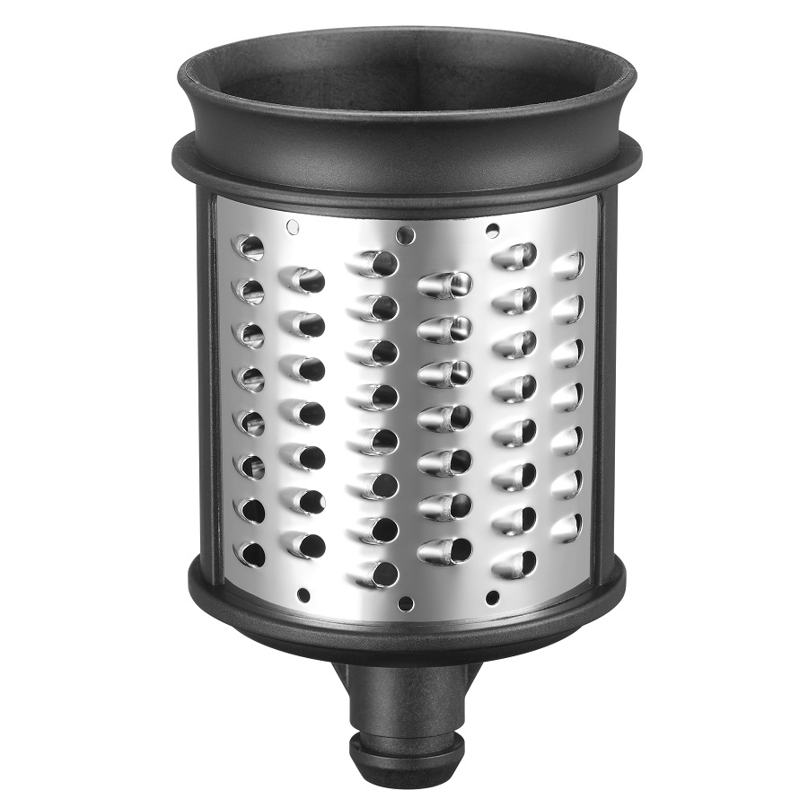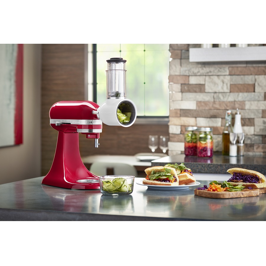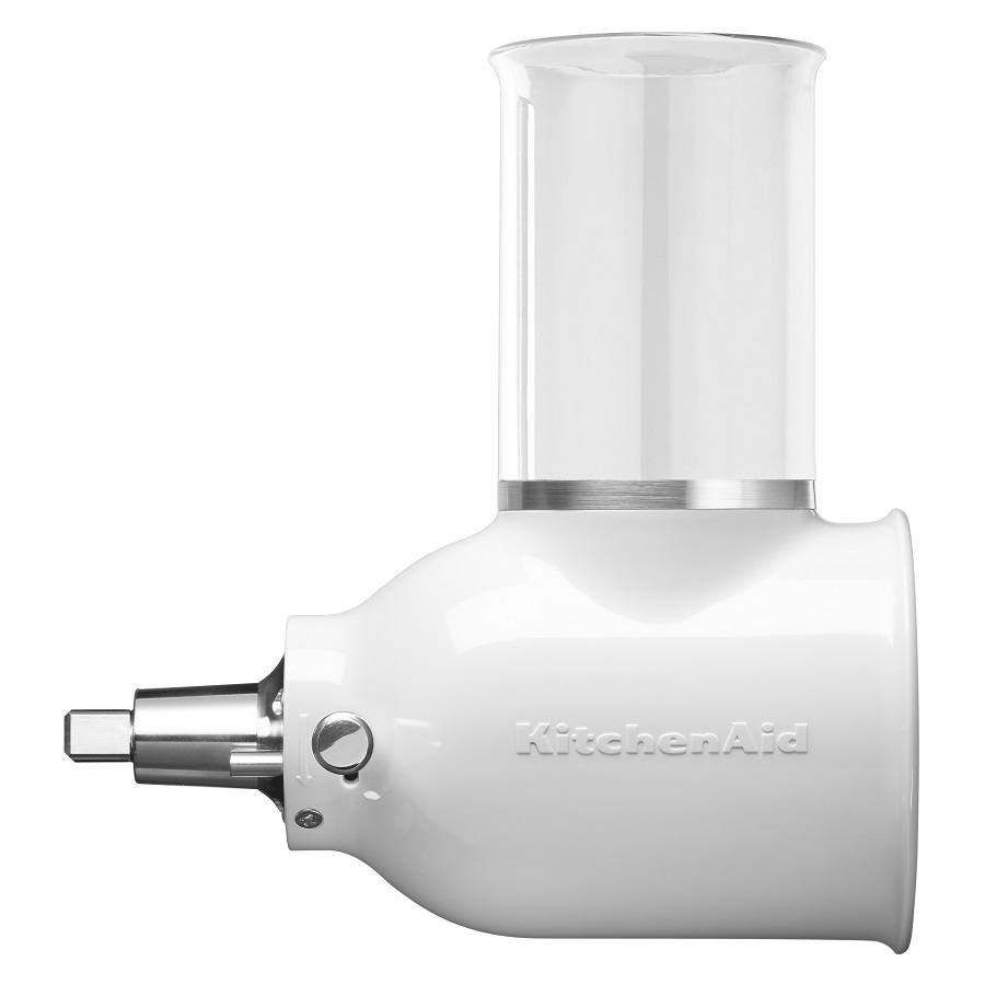Насадка-овощерезка KitchenAid для миксера усовершенствованной конструкции предназначена для нарезки и измельчения фруктов, овощей, корнеплодов, различных сортов сыра, шоколада, орехов и других продуктов. Приспособление укомплектовано тремя цилиндрическими ножами: для нарезки ломтиками, для крупной шинковки и для мелкой шинковки. Лезвия изготовлены из нержавеющей стали, корпус – из прочного безопасного пластика. Все части насадки можно мыть в посудомоечной машине.