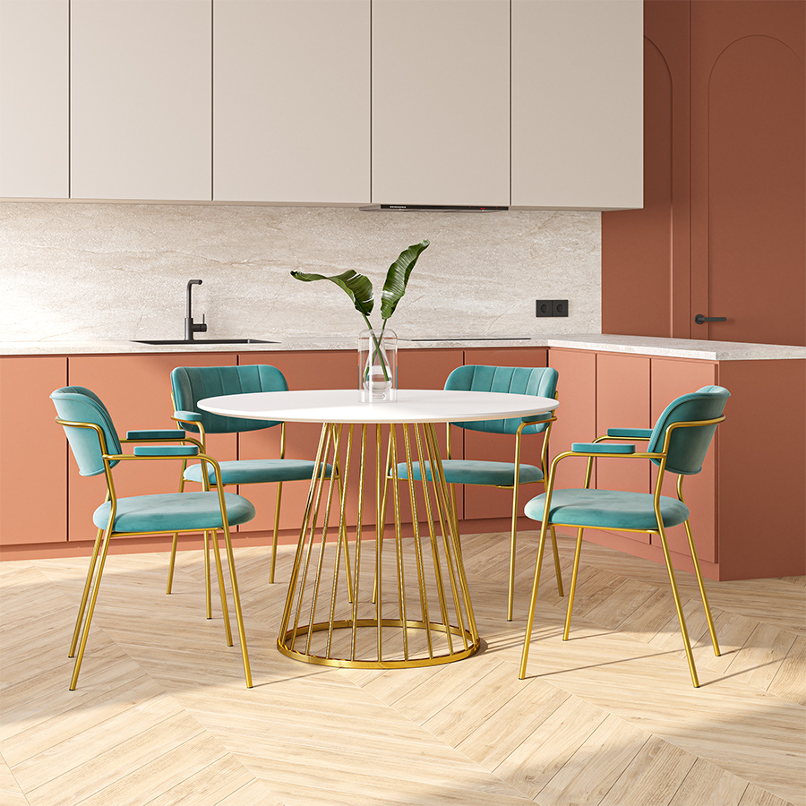Обеденная группа: стол Tyra, Ø110 см, белый/золотой и стул Eirill, темно-зеленый, 4 шт.