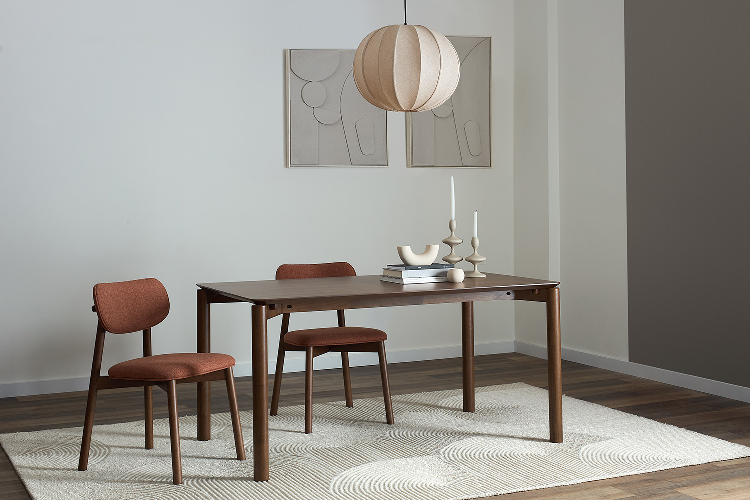- Обеденная группа Union: стол обеденный, 150х90 см, дуб и 6 стульев, рогожка, темно-коричневый/терракота