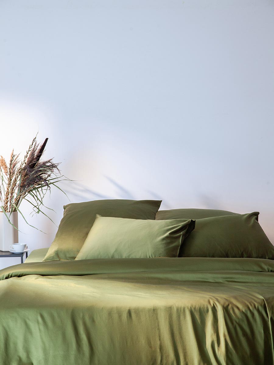 Простыня на резинке из премиального сатина оливкового цвета из коллекции Essential, 180х200х30 см