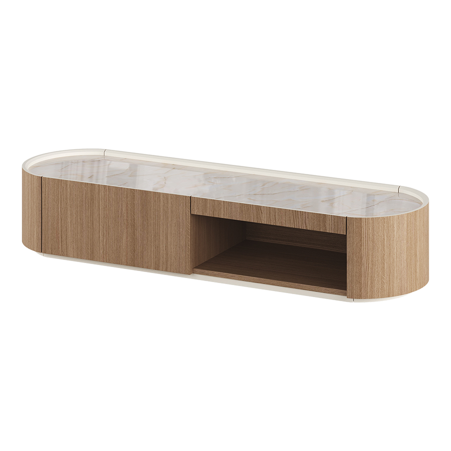 Тумба под ТВ Lagom – современное стильное решение для гостиной или спальни. Элегантный лаконичный дизайн и актуальный цвет позволяют органично включить ее в любой интерьер. Скругленный силуэт и ниша с открытой полкой визуально облегчают конструкцию и гармонизируют пространство. Высокая вместимость при компактных габаритах делает тумбу практичным элементом системы хранения. На верхней панели и открытой полке достаточно места для размещения техники, сопутствующих аксессуаров или декора.