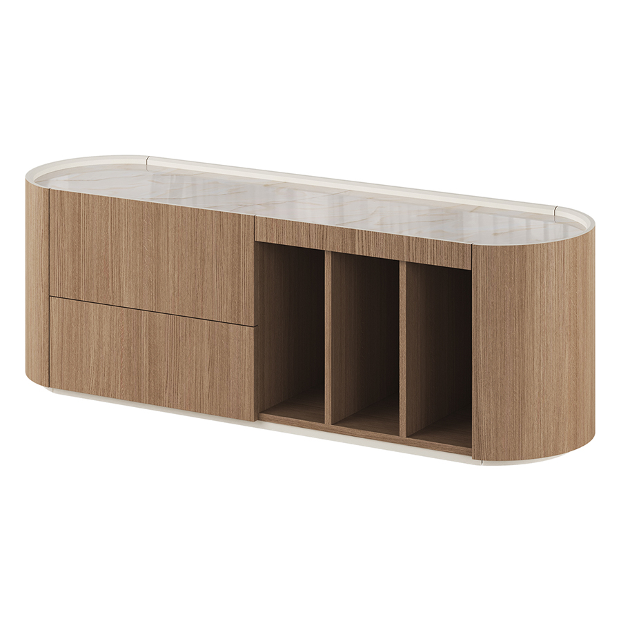Тумба под ТВ Lagom – современное стильное решение для гостиной или спальни. Элегантный лаконичный дизайн и актуальный цвет позволяют органично включить ее в любой интерьер. Скругленный силуэт и открытые ниши визуально облегчают конструкцию и гармонизируют пространство. Высокая вместимость при компактных габаритах делает тумбу практичным элементом системы хранения. На верхней достаточно места для размещения техники, сопутствующих аксессуаров или декора.